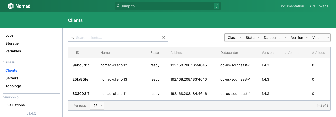 Navigate to the Clients page from the same menu to see a list of the deployed Nomad clients: